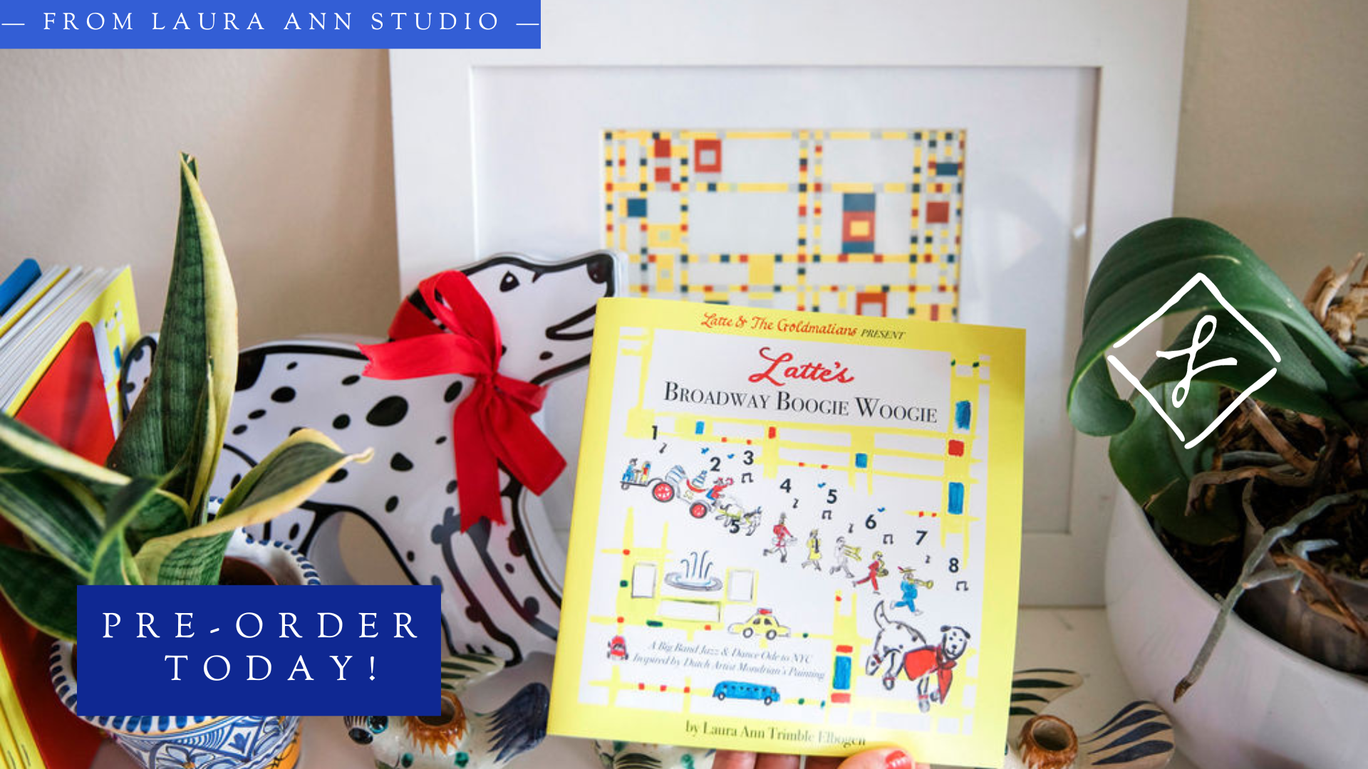 It’s finally here! Meet Latte & The Goldmatians! Pre-order for Latte’s Broadway Boogie Woogie: A Big Band Jazz & Dance Ode to NYC Inspired by Dutch Artist Mondrian’s Painting, the inaugural title of the new picture book series, has arrived just in time for the 14th birthday of Laura Ann Studio.